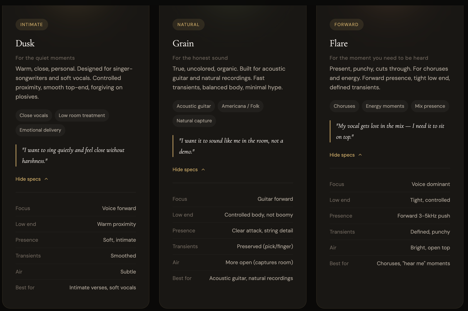 Record the verse through Dusk — warm, intimate, close. Then switch to Flare for the chorus — present, punchy, forward. The tonal shift mirrors the emotional shift in the song, and both sections are optimized for their respective energy levels.